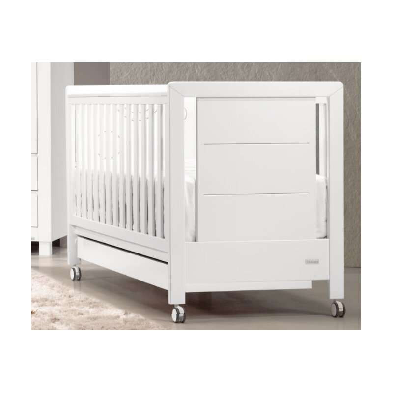 Cuna Trama Inova Medidas internas: 120 x 60 cm 3 posiciones de somier en versión cuna / 5 posiciones de somier en versión cuna-colecho Lateral abatible con sistema oculto Ruedas giratorias con freno Material: Madera de pino / MDF lacado Cajón cuna OPCIONAL