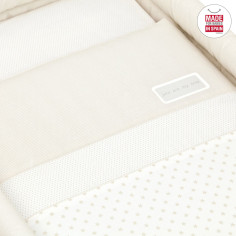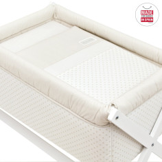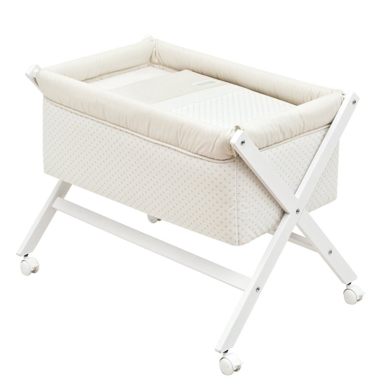 La minicuna con estructura en forma de aspa de Cambrass está fabricada en madera de haya. Permite el descanso del bebé en cualquier estancia de la casa durante los primeros meses de vida gracias a la movilidad que le aportan las ruedas (con freno).Otros aspectos que hacen especialmente funcional esta minicuna, incluye almohada, colchón y somier de madera de 5mm, soporte de madera y su vestidura cosida que incluye la colcha con relleno extraíble para su lavado o para el uso invierno / verano.. Por recomendación de la normativa Europea (EN 1130 UNE-EN 11890:2018) y del real decreto 1801/2003 sobre la seguridad general de los productos, la minicuna no puede ser plegable. Según normativa, este producto soporta bebés con un peso de hasta 14 kg