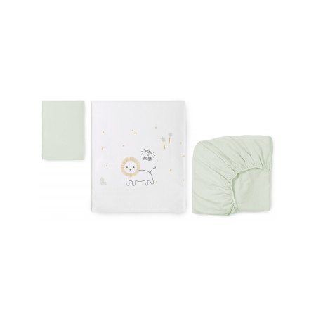 Las sábanas de la colección Nairobi destacan por su suavidad, ya que están fabricadas con algodón, pensadas y hechas especialmente para estar en contacto con la delicada piel de tu bebé. Son transpirables, absorbentes e hipoalergénicas.La bajera y la funda de almohada, son de color menta, dando un toque único al conjunto.