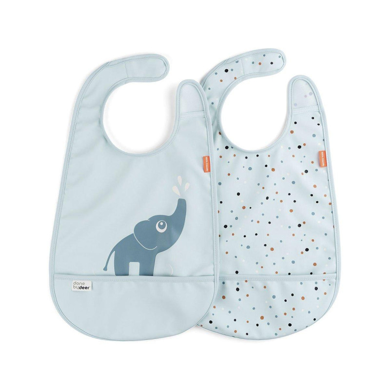 Tu amigo ciervo está listo para hacer que la hora de comer sea menos complicada con este práctico juego de dos baberos con velcro impermeables que son fáciles de limpiar y con un bolsillo inteligente para recoger la comida que falta. Este juego le ahorrará mucho tiempo de limpieza. Los baberos blandos tienen un cierre de velcro que hace que los baberos sean muy fáciles de poner y quitar. El lindo juego de baberos está en un tono azul suave. Uno está decorado con Elphee salpicando agua y el otro está cubierto con Happy Dots en colores suaves.