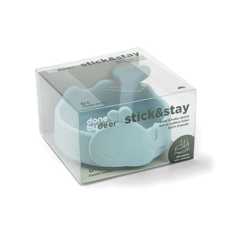 El cuenco y la cuchara de silicona Stick & Stay están diseñados para que los más pequeños exploren el mundo de la comida. Wally nada alrededor del cuenco y la cola de la cuchara está lista para entretener sumergiéndose en la comida. El juego tiene un tamaño perfecto para los nuevos consumidores. Presione el recipiente hacia abajo y se adherirá a la mayoría de las superficies lisas con succión natural. El borde alto del cuenco facilita recoger la comida y las ondas crean un lugar para que descanse la cuchara. La cuchara blanda es adecuada tanto para alimentar como para comer. Los más pequeños disfrutarán explorando una comida con Wally del divertido set en azul, y Wally no puede esperar a ver qué hay en el menú.
