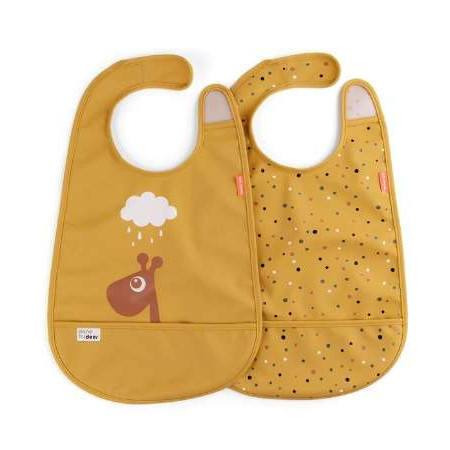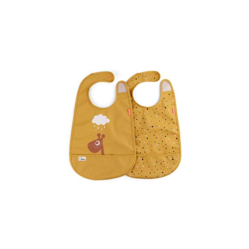 Tu amigo ciervo está listo para hacer que la hora de comer sea menos complicada con este práctico juego de dos baberos con velcro impermeables que son fáciles de limpiar y con un bolsillo inteligente para recoger la comida que falta. Este juego le ahorrará mucho tiempo de limpieza. Los baberos blandos tienen un cierre de velcro que hace que los baberos sean muy fáciles de poner y quitar. Los lindos baberos tienen un suave tono mostaza. Uno está decorado con Raffi y una nube de lluvia y el otro está cubierto con Happy Dots en colores suaves.