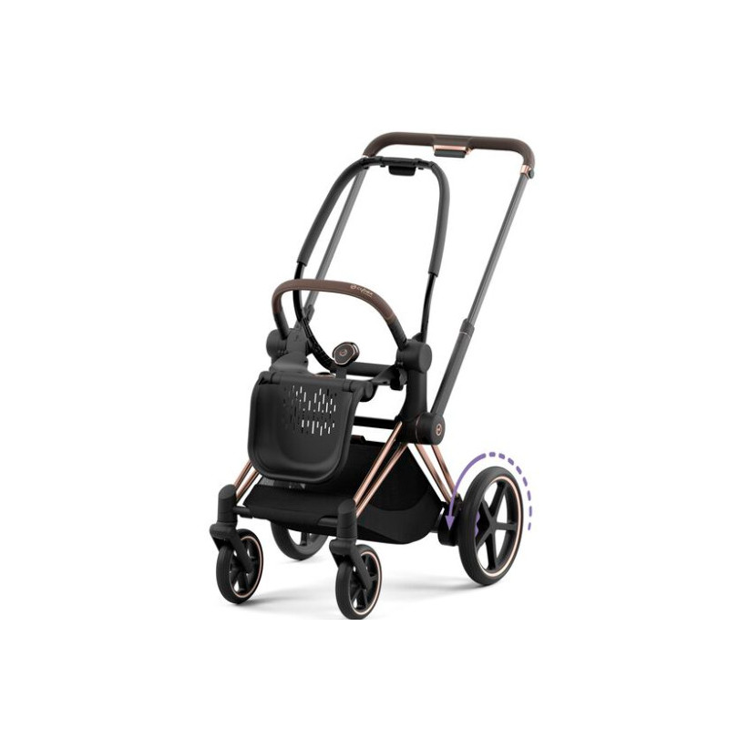 El chasis e-Priam es el punto de encuentro entre la tecnología inteligente y el diseño atemporal. Combínalo con un pack de asiento Priam, un capazo Priam Lux o una silla de coche portabebés CYBEX para disfrutar de asistencia en pendientes y una función de balanceo (los productos individuales se venden por separado).