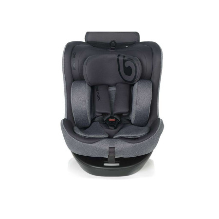 Giro 360º. Dispone de cojín trasero para evitar el choque con el asiento delantero en caso de impacto. El cabezal tiene diferentes posiciones para que se adapte a la altura del bebé desde los 40cm hasta los 150cm. Instalación con isofix, top tether y el arnés de la silla de 40-105cm. A partir de los 105cm instalación con isofix y cinturón del automóvil.