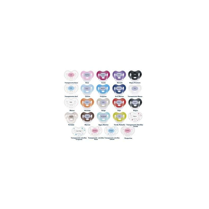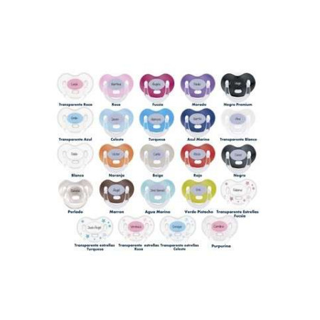 Preciosos chupetes que podrás personalizar con el nombre del bebé. Están fabricados en España y son libres de Bisfenol A, bajo la supervisión de expertos. Una vez fabricados, pasan un exhaustivo examen en los laboratorios de la Asociación de Investigación del Juguete. Hay más de 15 modelos con colores diferentes, para que puedas elegir el que más te guste. La personalización está hecha mediante una técnica imborrable sin tintas, eliminando así todo tipo de toxicidad para el bebé. Las tetinas de los chupetes son anatómicas a elegir en silicona o látex y en dos tamaños, 0-6 y 6-36 meses. Los chupetes llevan una tapa protectora esterilizadora, que sirve para mantener limpio el chupete y para esterilizar el chupete de forma individual y muy sencilla.