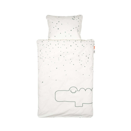 La ropa de cama Croco de suave algodón orgánico proporcionará un ambiente confortable para dormir a los más pequeños. El lindo estampado neutral en cuanto al género con el fresco cocodrilo dormitando agregará un ambiente divertido a cualquier habitación infantil o infantil. La ropa de cama dispone de una práctica cremallera de seguridad YKK oculta tanto en la funda de almohada como en la funda nórdica. Está empaquetado en una pequeña bolsa de algodón, a juego con la ropa de cama, que puede usarse para juguetes, una muda de ropa, zapatos u otros fines prácticos. La ropa de cama infantil orgánica tiene un tono arenoso claro con hojas tropicales en diferentes tonos de verde y un cocodrilo muy adormecido.