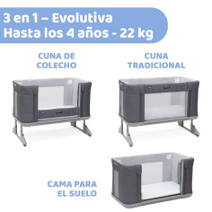 COLECHO PROLONGADO: Con Chicco Next to Me Forever podréis practicar el colecho más allá de los 6 meses para disfrutar del colecho y todos sus beneficios hasta que estéis preparados para el cambio a cuna tradicional. CONVERTIBLE EN CAMA: Esta cuna se transformará en cama para el suelo gracias a sus patas extraíbles y su sistema de panel lateral. Así se fomenta la independencia a partir de los 18 meses (inspirado en Montessori) ADAPTABLE: Esta cuna cuenta con 11 niveles de altura diferentes para adaptarse a cualquier cama, y sus patas se doblan para poder instalarla en camas con canapés o cajoneras. INCLUYE COLCHÓN: Colchón con forma exclusiva que se adapta perfectamente a la estructura de la cuna. Gracias a su superficie rígida sujeta correctamente al bebé durante su uso, garantizando u