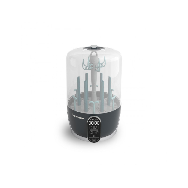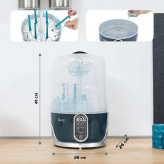 Esterilización en 8 minutos, para eliminar las bacterias más resistentes (99 %) y combatir los olores desagradables y los depósitos de calcio procedente de la leche Secado purificante que protege de la humedad y elimina el 99 % de los contaminantes suspendidos en el aire (ácaros, alérgenos, algunos virus, mohos…) Programación de la función « Secado purificante »: 30, 45 o 60 minutos Almacenamiento práctico en un entorno purificado durante 24 horas Universal gracias a sus boquillas extraíbles (para biberones, sacaleches, vajilla, juguetes de plástico…) Fácil de usar gracias a su ciclo « todo en 1 » o a la selección manual de las funciones 2 filtros HEPA incluidos (cambiar cada 6 meses) Alerta antical Parada automática Pantalla de control LCD