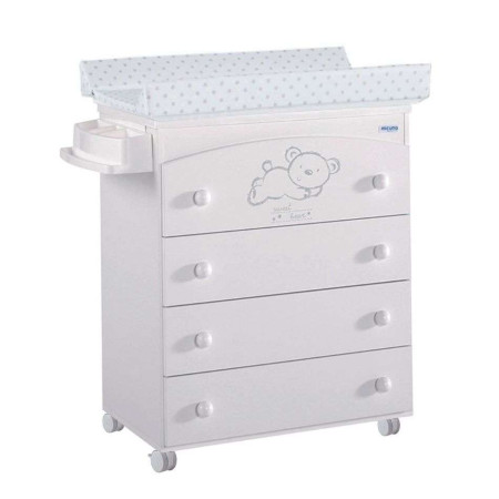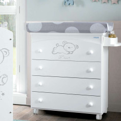 La bañera Sweet Bear tiene en su interior una cómoda cubeta con jabonera y desagüe. En la parte superior, incorpora un práctico cambiador de plástico, con un elegante tapizado de estrellas gris. Ruedas incorporadas, para facilitar su movilidad. Gracias a su complemento opcional de pata fija, podrá transformarse en una práctica cómoda eliminando las ruedas, la cubeta y el cambiador.