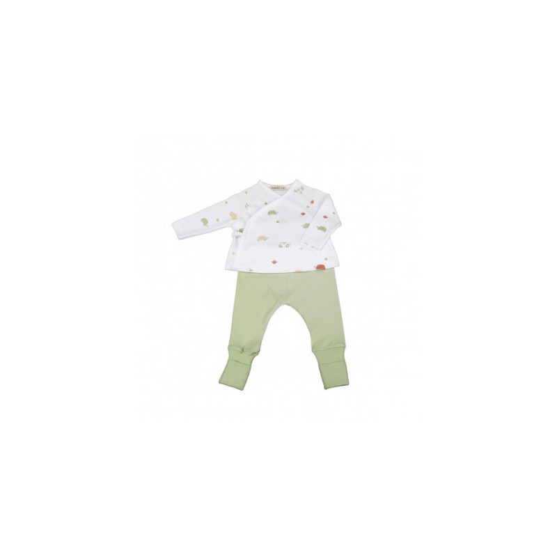 Conjunto de punto liso de algodón compuesto por:JUBÓN estampado, de corte kimono POLAINA de color verde musgo liso, con cinturilla de canalé.Talla 0-1