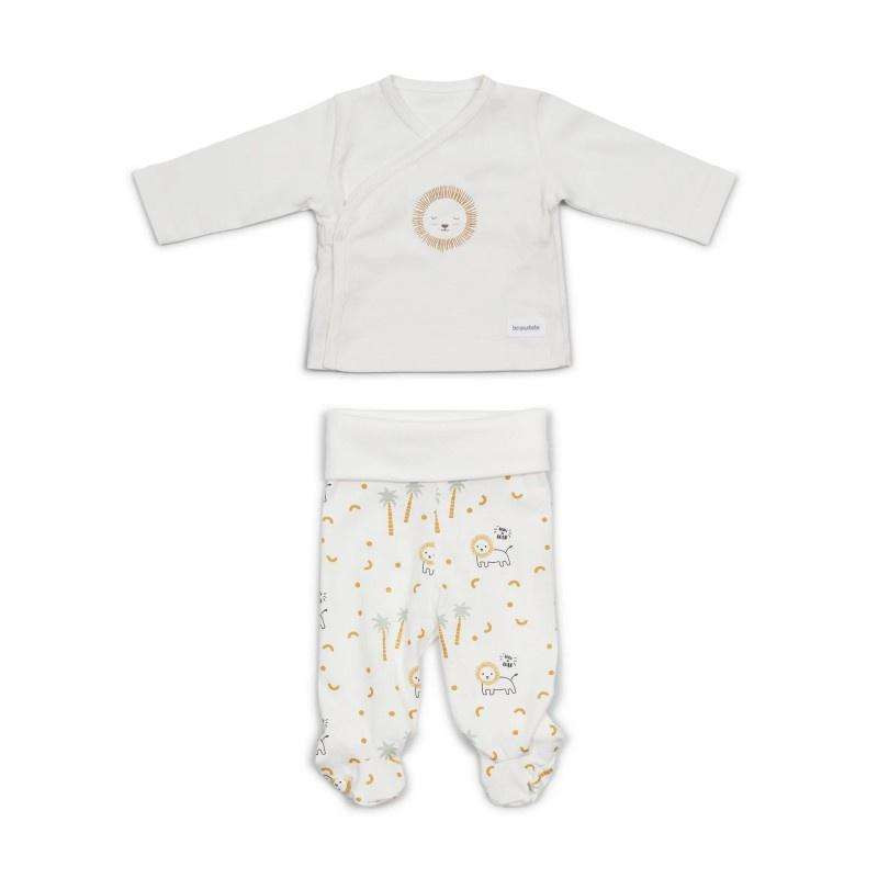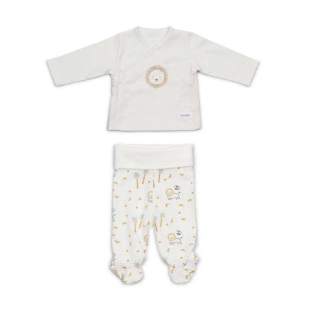 Conjunto de dos piezas. La camiseta lleva dos botones en la parte interior para hacer más cómodo el cambio. Es ideal para bebés de 0 a 1 mes. Está fabricado con jersey 100% algodón. Es eco-friendly y está éticamente fabricado con la certificación OEKO-TEK®. Consejos para su mantenimiento: lavar a máquina a 40ºC, no usar lejía, no secar en la secadora y planchar suave.