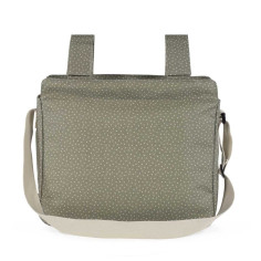 Bolso cambiador Poppy Musgo de topito para silla de paseo que incluye cambiador para bebe. Bolsa canastilla muy ligera, resistente y de gran capacidad para llevar todo lo necesario para el paseo del bebe. Tiene multiples bolsillos para poder tener todo ordenado. Dispone en el exterior de un práctico bolsillo frontal para tener a mano lo imprescindible. En el interior incopora un bolsillo plastificado para la ropa húmeda, un bolsillo térmico para biberones y dos bolsillos para lo que necesites tener más a mano. La bolsa tiene un sistema universal de fijación, con 2 asas cortas que facilita la colocación en la silla de paseo. También incorpora una asa larga para poder colgarla en el hombro. Gran calidad y mucho estilo