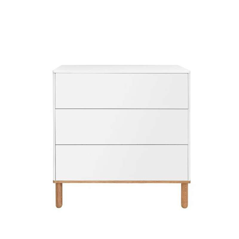 En la cómoda Toteme podrás cambiar perfectamente a tu bebé y podrás almacenar todo aquello que necesita en sus espacioso cajones. La cómoda consta de tres amplios cajones dónde podrás guardar todo lo que necesita tu bebé. Los cajones y las puertas están equipados con el sistema push to open . La parte superior, los frentes y laterales de los cajones están hechos de MDF en lámina blanca mate con mayor resistencia a los arañazos, daños y huellas dactilares. El marco está hecho de tablero laminado de alta calidad resistente al desgaste y humedad, fácil de limpiar y mantener. Las patas están hechas de madera de roble.