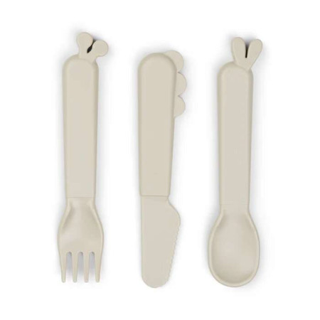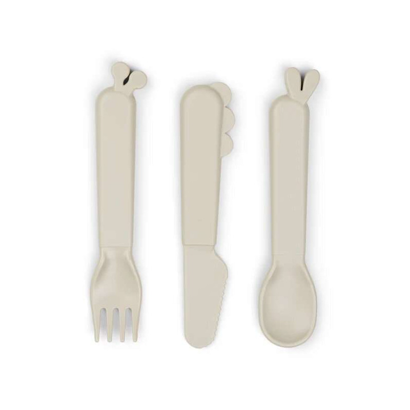 El juego de cubiertos Kiddish con amigos Deer tiene formas redondeadas para que los niños pequeños practiquen comer solos de forma segura. Los cubiertos están bien dimensionados para manos pequeñas y los niños los han probado minuciosamente. Los cubiertos Kiddish para bebés y niños pequeños se fabrican en Dinamarca y son reciclables. Cuando los cubiertos se desgastan, se pueden clasificar como plástico duro y reciclarlos para producir nuevos productos para la vida cotidiana. El bonito juego de cubiertos de arena consta de una cuchara con orejas de Lalee, un tenedor con orejas de Raffi y un cuchillo con escamas de Croco. Los cubiertos tienen una superficie mate sedosa y combinan con el resto de la colección Kiddish.